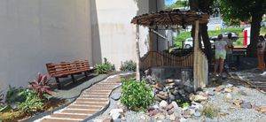 Le puits existant a été mis en valeur grâce à un habillage en bambou qui renforce l’esthétique du jardin et offre de l'ombrage. Des espaces de détente ont été aménagés (bancs) et éclairés la nuit pour favoriser la convivialité et l’appropriation du lieu par les habitants.