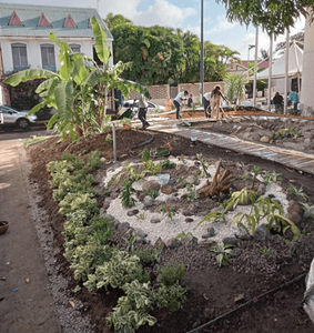 Le jardin Lakou Emma, porté par la mairie du Diamant (Martinique), est bien plus qu’un simple aménagement paysager. En transformant une dent creuse longtemps délaissée en un îlot de fraîcheur accueillant, il contribue à améliorer le cadre de vie tout en renforçant le lien social entre les habitants, autour de pratiques de cultures et de temps partagés. La singularité du projet réside dans ses racines : un chantier d’insertion, mené par une équipe attentive à la fois à l’environnement naturel et aux usages du lieu. Ici, les manguiers - déjà arbres à palabres - deviennent arbres de pluie, symboles d’un projet qui sait faire dialoguer convivialité, appropriation sociale et potentiel de rafraîchissement urbain.