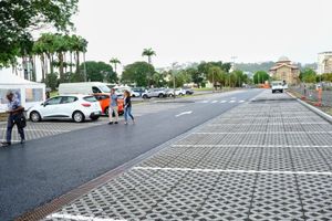 Pour répondre aux contraintes insulaires et à la présence d’une nappe saline soumise aux marées, le parking de la Savane a été conçu sur une structure drainante souple qui assure sa transparence hydraulique. Un réseau de noues, bassins d’infiltration et cavités techniques capte et restitue progressivement les eaux pluviales. Cette chaussée réservoir expérimentale limite les écoulements vers la ville basse et favorise le rafraîchissement de la zone.